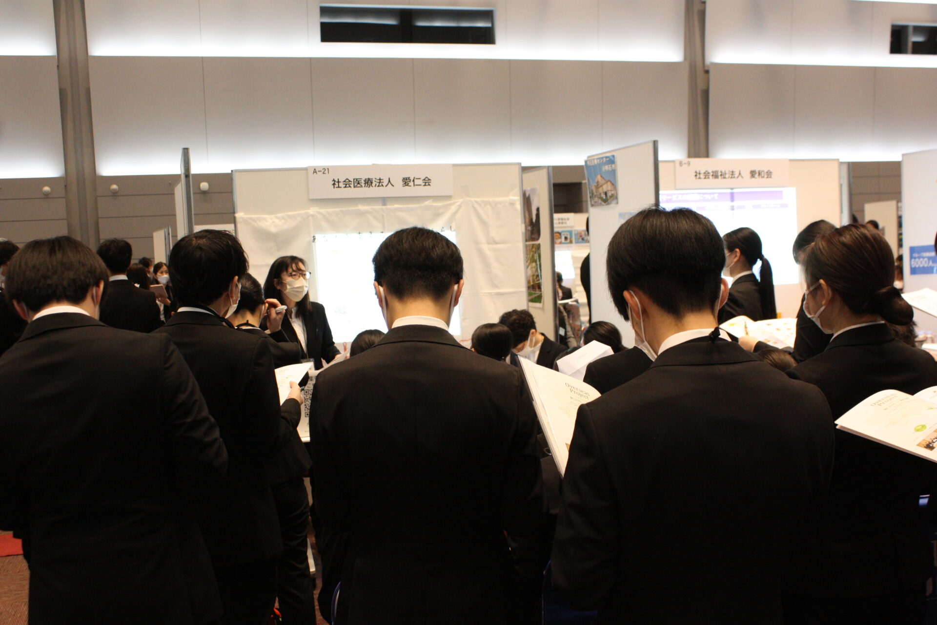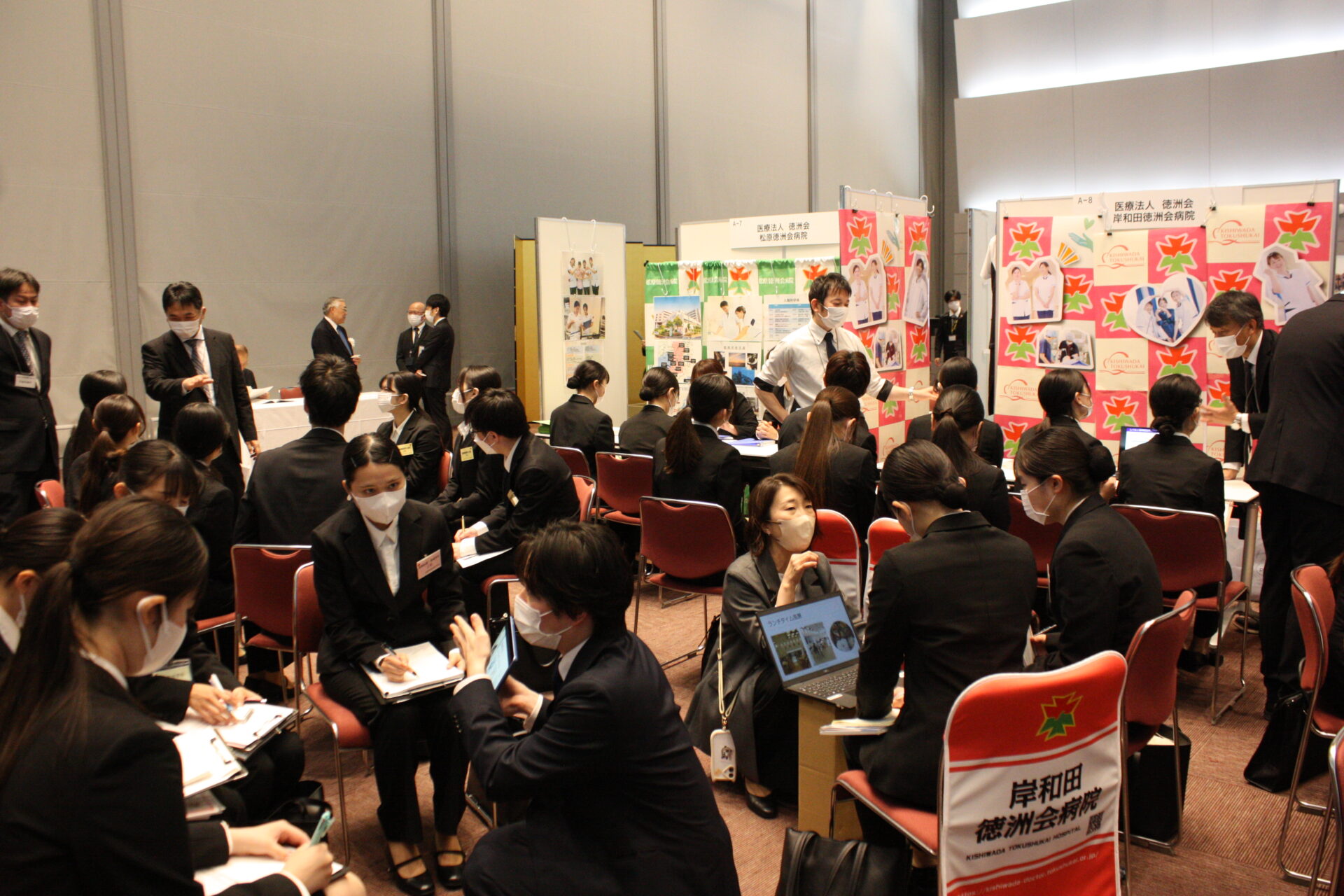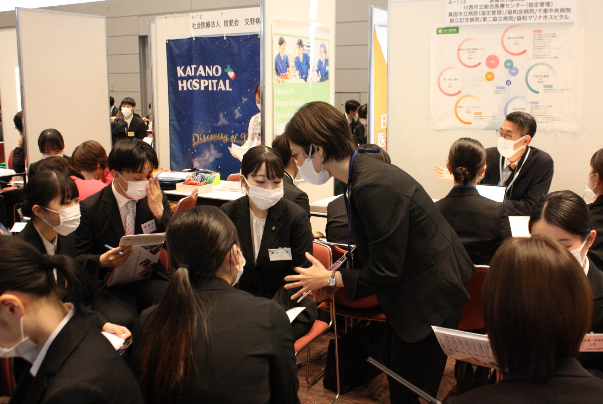 開会式が終わり、就職フェアがスタート。大阪府や兵庫県などで病院や介護施設などを運営する社会医療法人愛仁会は看護師50人、セラピスト35人、総合職10人、介護職10人を募集するとあって、そのブースには黒山の人だかりが。担当者の説明に、学生たちは聞き入っていました。「12連休とれます!」「診療費補助」「副業OK!」などとPRする事業所や、資格取得支援など好条件をうたう事業所のブースも大勢の学生が詰めかけていました。