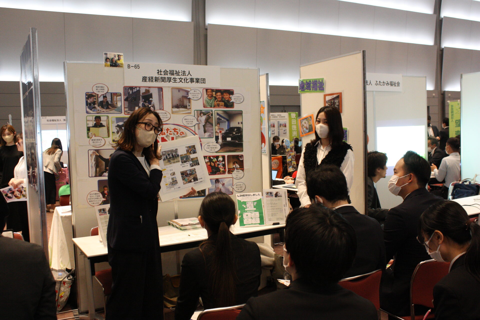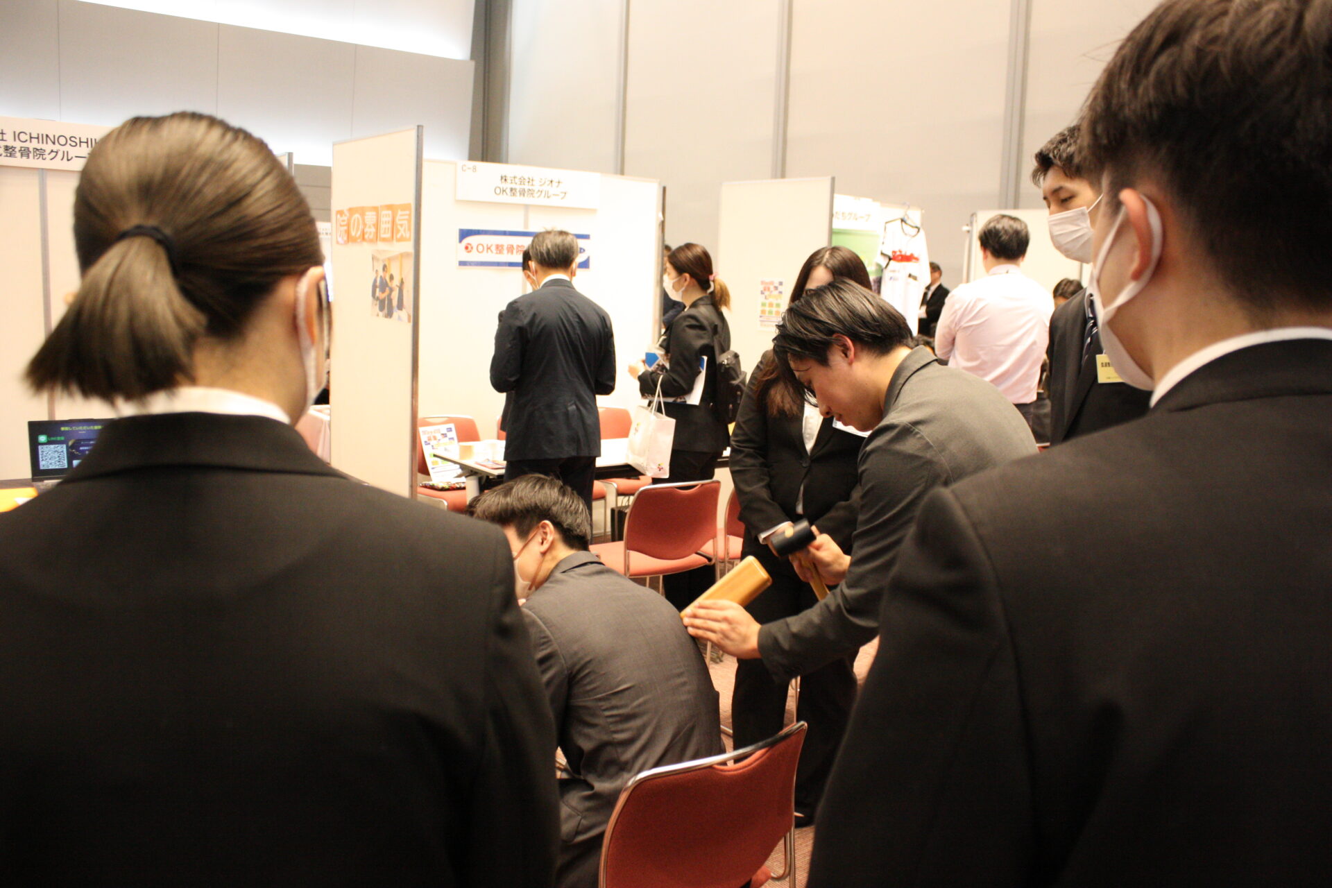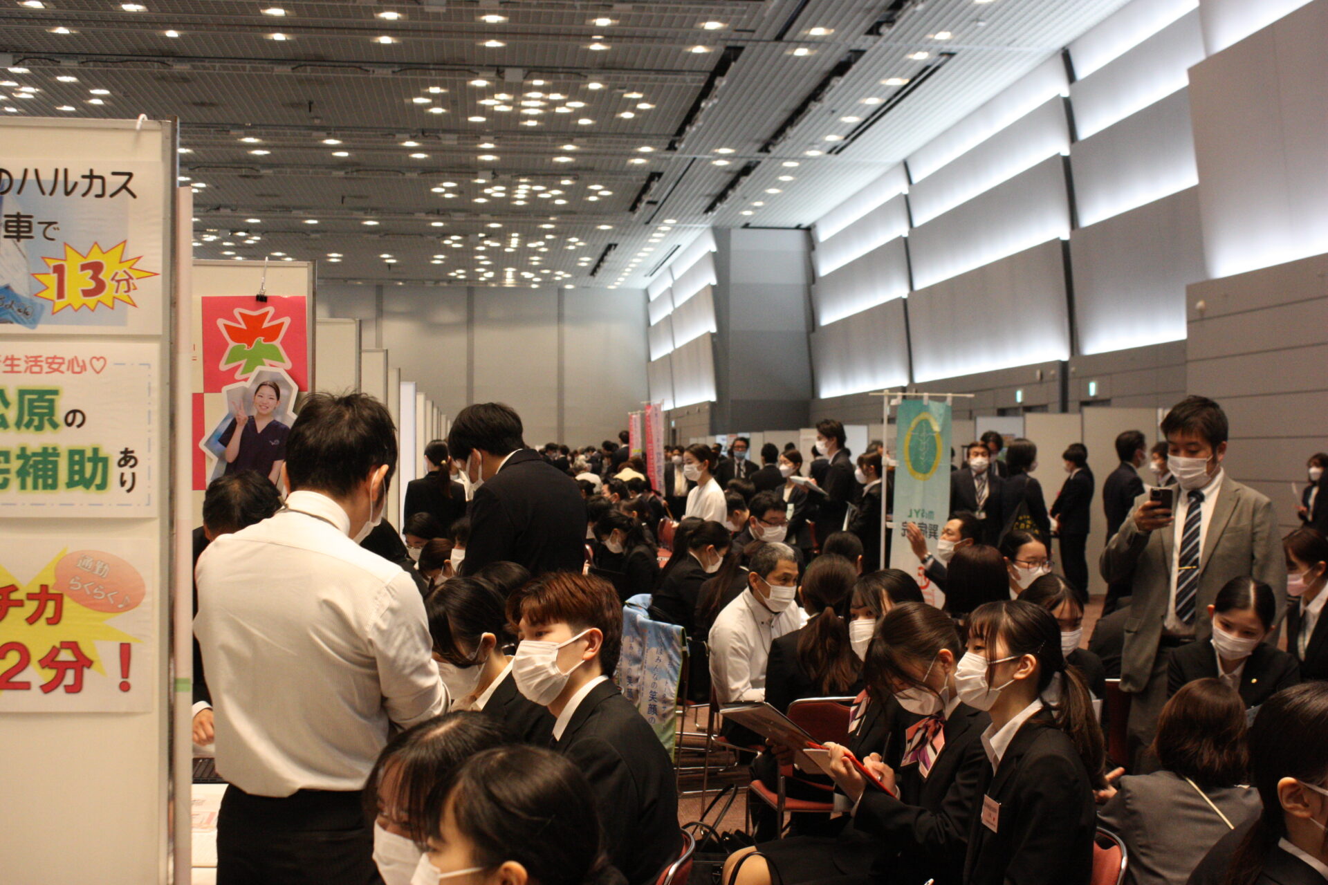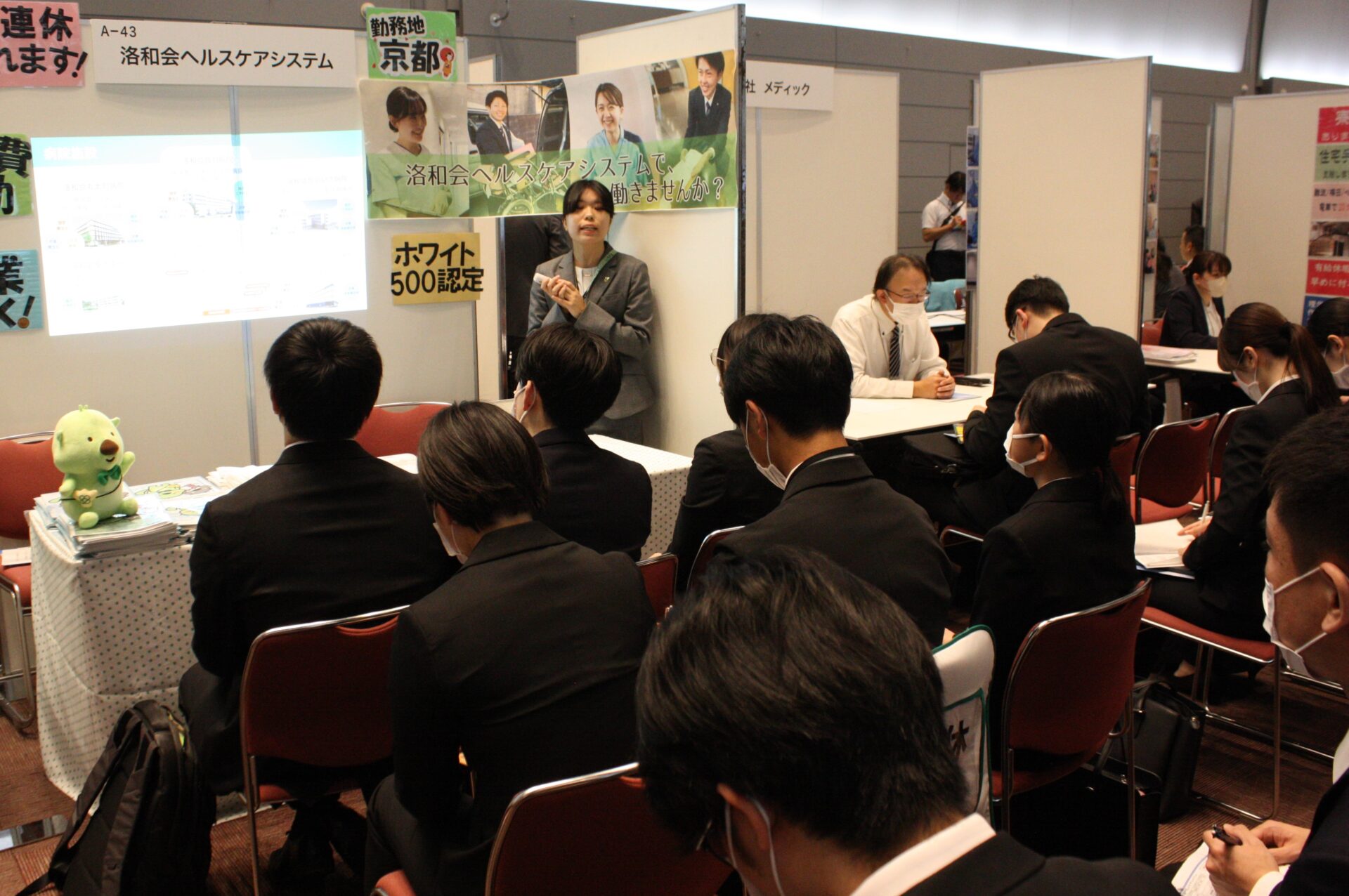 開会式が終わり、就職フェアがスタート。大阪府や兵庫県などで病院や介護施設などを運営する社会医療法人愛仁会は看護師50人、セラピスト35人、総合職10人、介護職10人を募集するとあって、そのブースには黒山の人だかりが。担当者の説明に、学生たちは聞き入っていました。「12連休とれます!」「診療費補助」「副業OK!」などとPRする事業所や、資格取得支援など好条件をうたう事業所のブースも大勢の学生が詰めかけていました。