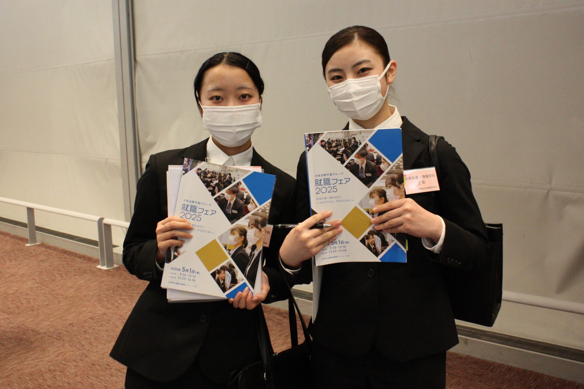 フェアには、大阪医療技術学園専門学校、大阪ハイテクノロジー専門学校、大阪保健福祉専門学校、大阪医療福祉専門学校、大阪医療看護専門学校の5校の学生のほか、美作市スポーツ医療看護専門学校と滋慶医療科学大学、グループ校である京都医健専門学校の学生たちも参加しました。