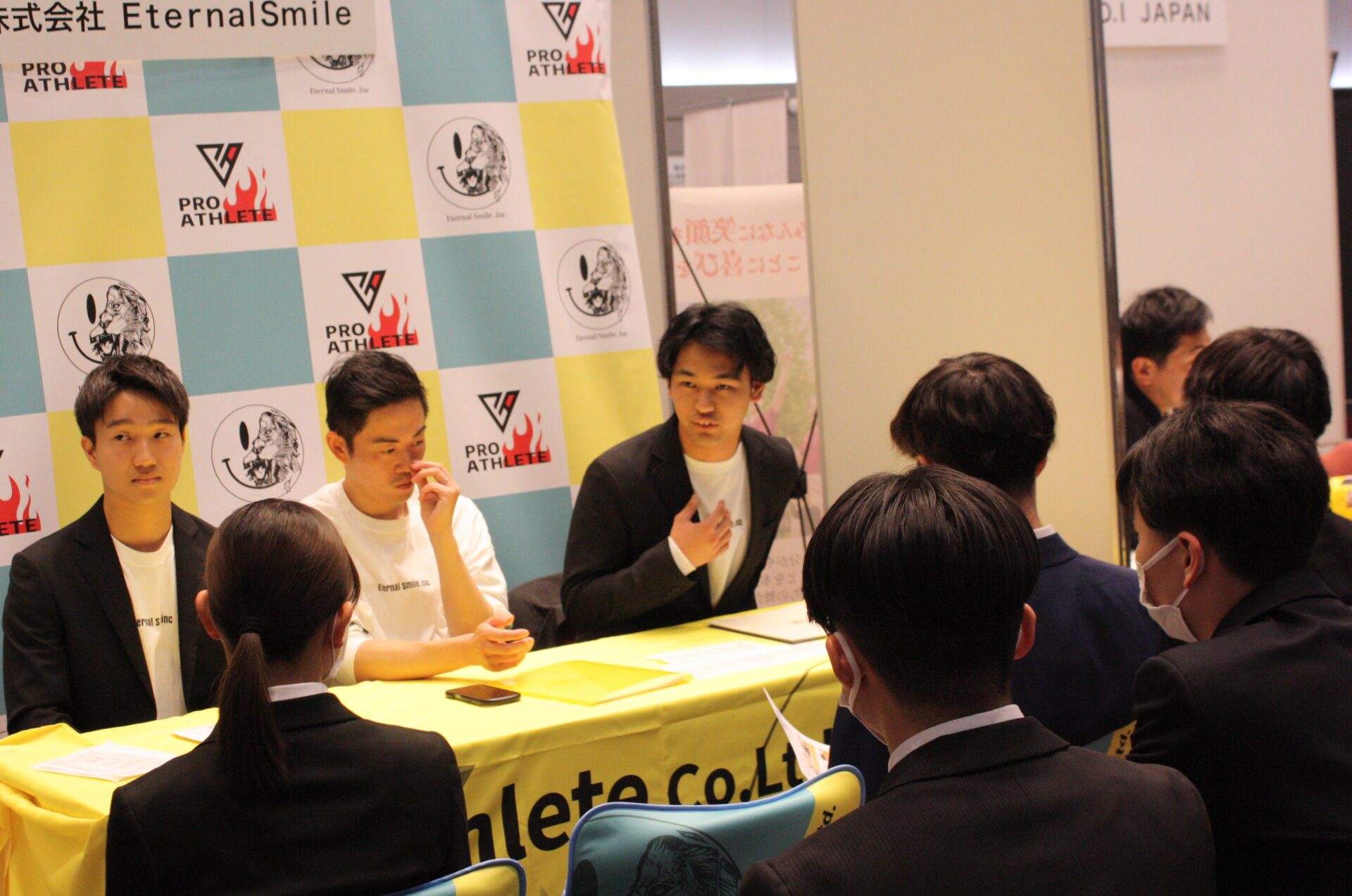 また、会場では、大阪滋慶学園の卒業生たちが勤め先の事業所について説明する姿も見られました。大阪府や兵庫県で鍼灸整骨院を展開する株式会社EternalSmileのブースでは、この春に大阪ハイテクノロジー専門学校を卒業したばかりの大浦春紀さんが応対。事業所の説明だけでなく、「後輩たちの不安を少しでも和らげてあげたい」と自身がこの会社に入社した経緯を説明したり勉強法についてアドバイスしたりしていました。このほかにも多くの卒業生が後輩学生たちを親身になって応対していました。