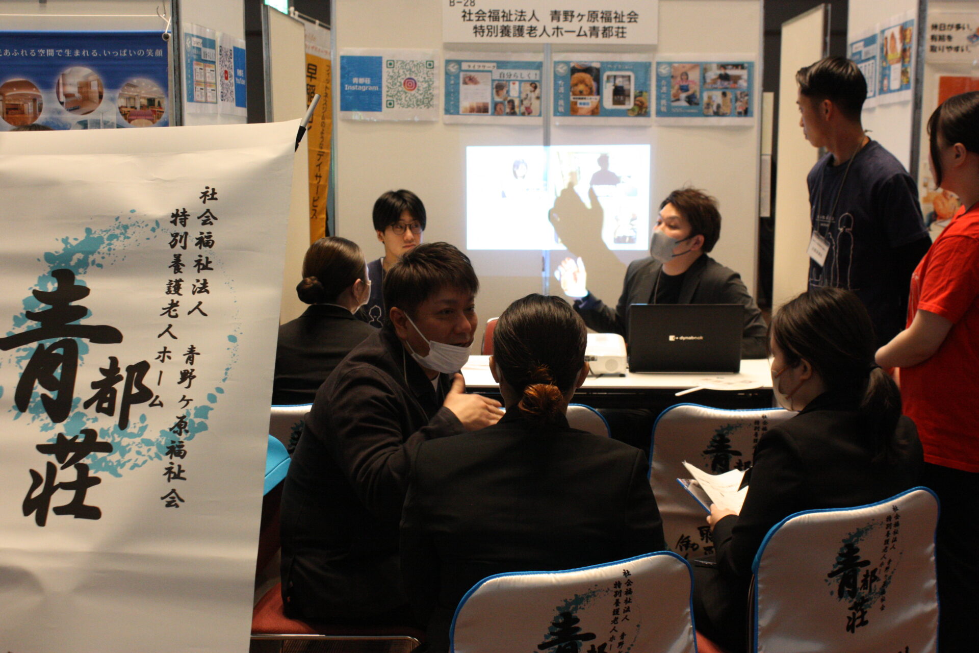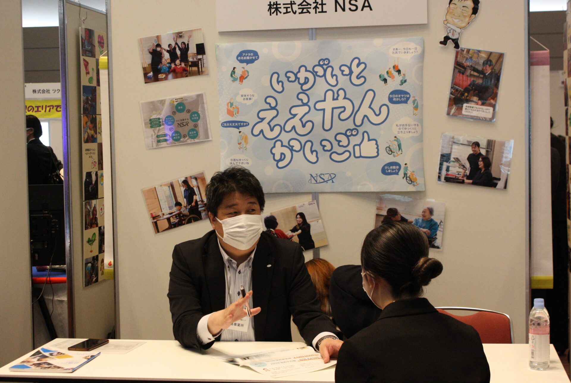 参加した事業所の中には、滋慶学園OBが起業した会社もありました。大阪保健福祉専門学校の卒業生が起業した株式会社NSA(大阪市中央区)で、多くの住宅型有料老人ホームを運営するほか、訪問介護、訪問看護、不動産事業などを展開する会社です。同社のブースには、「いがいと ええやん、かいご」というメッセージが掲げられ、目を引いていました。