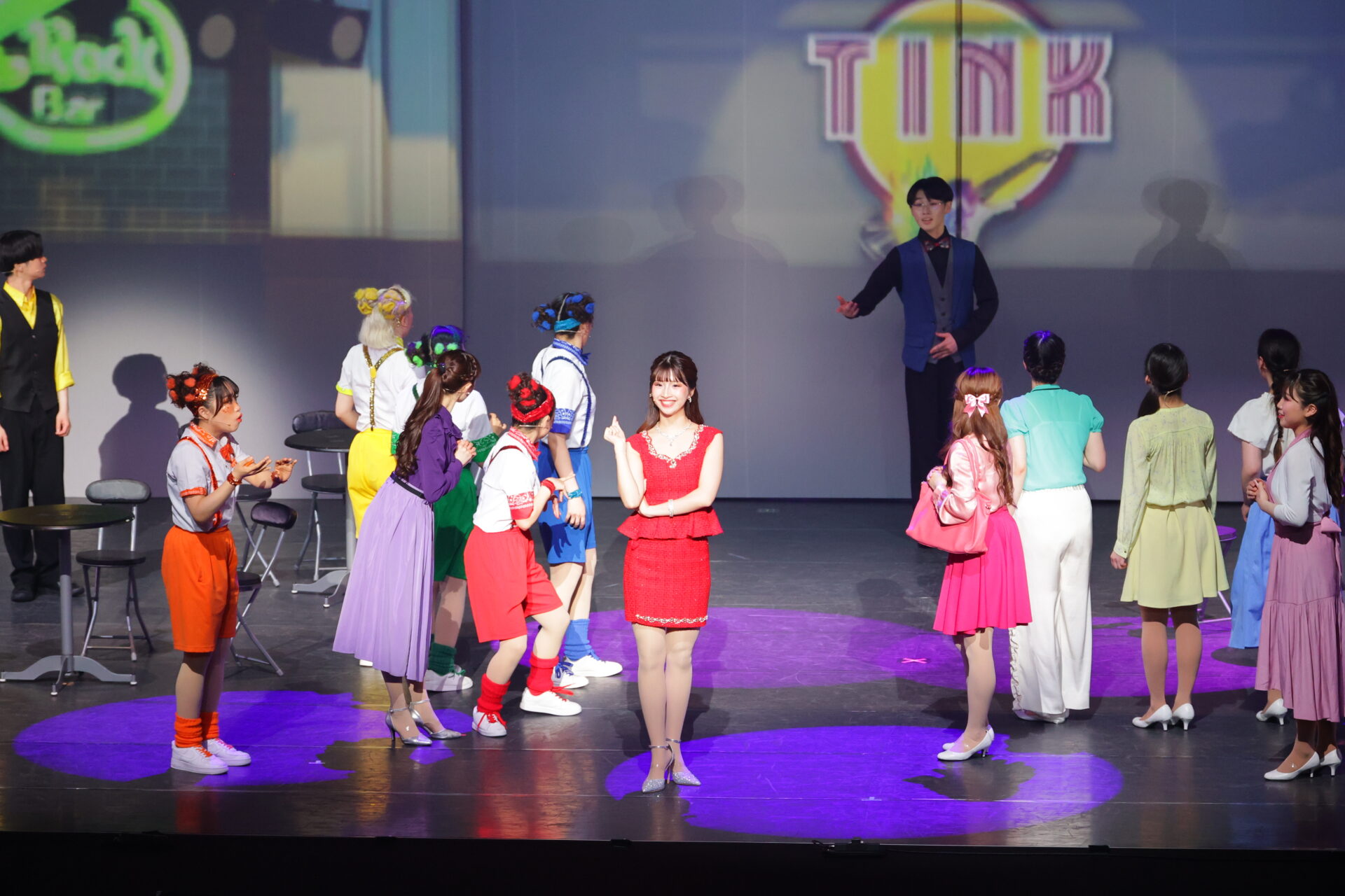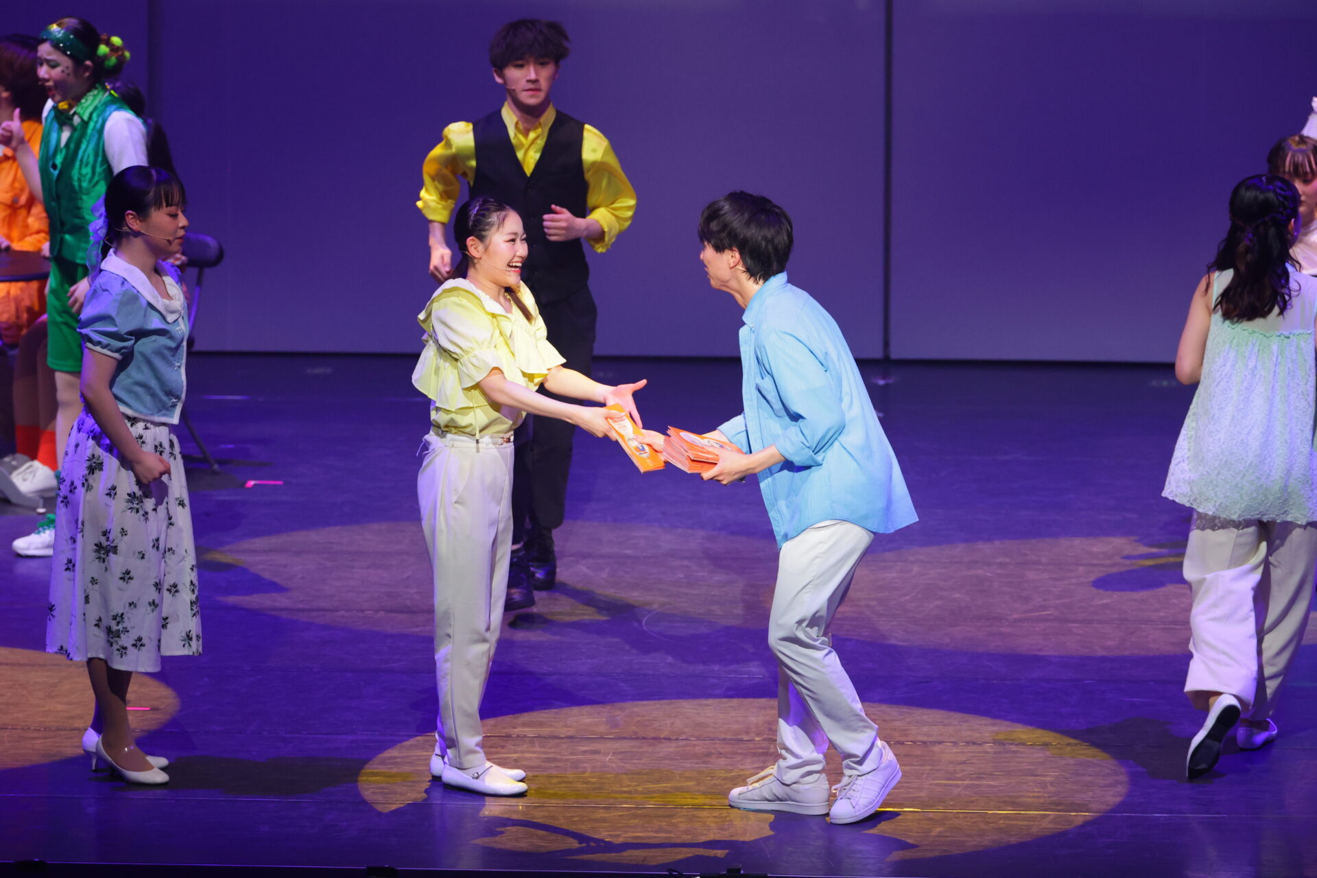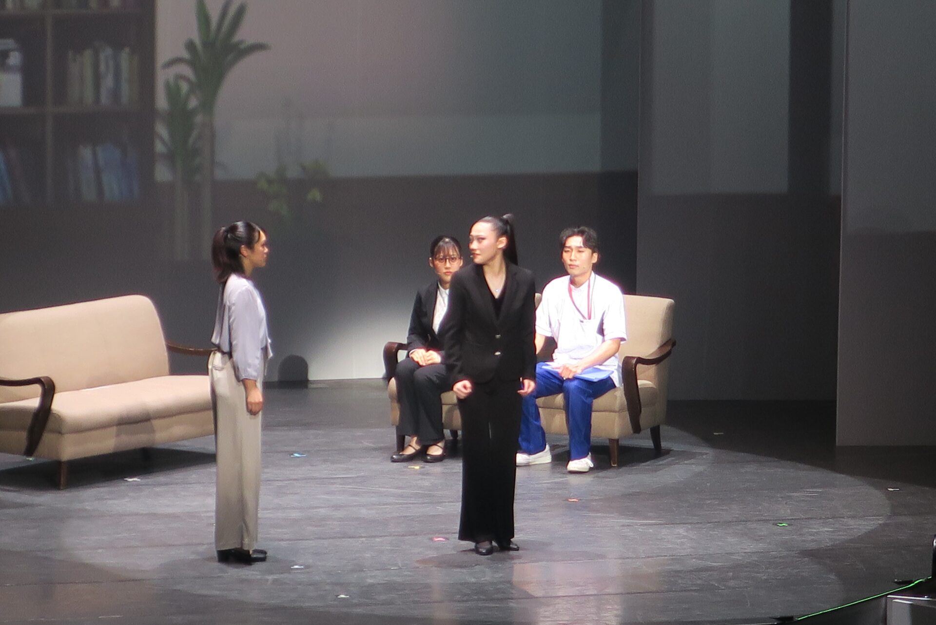 今回の万博公演では、世界へ向けて発信することを意識して、舞台の両脇のスクリーンに英語、中国語、韓国語、日本語の4カ国語の字幕が映し出されました。また、姿を消したゆかりを仲間たちが探しに行こうとするシーンでは、お嬢様劇団員の麗華から車を用意するよういわれた付き人役が「空飛ぶクルマをご用意しています」と、万博の目玉である「空飛ぶクルマ」を取り入れたセリフで会場を沸かせました。台本にはないセリフで、アドリブだったようです。