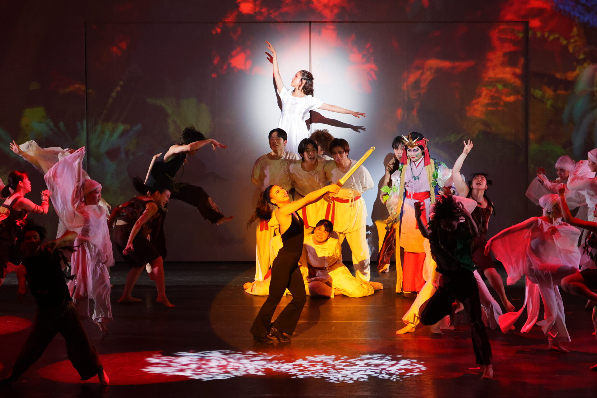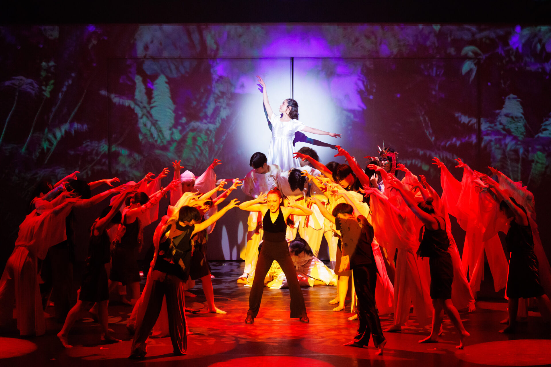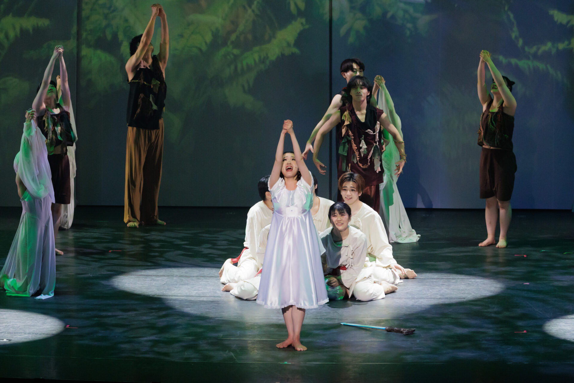 今回の万博公演では、世界へ向けて発信することを意識して、舞台の両脇のスクリーンに英語、中国語、韓国語、日本語の4カ国語の字幕が映し出されました。また、姿を消したゆかりを仲間たちが探しに行こうとするシーンでは、お嬢様劇団員の麗華から車を用意するよういわれた付き人役が「空飛ぶクルマをご用意しています」と、万博の目玉である「空飛ぶクルマ」を取り入れたセリフで会場を沸かせました。台本にはないセリフで、アドリブだったようです。