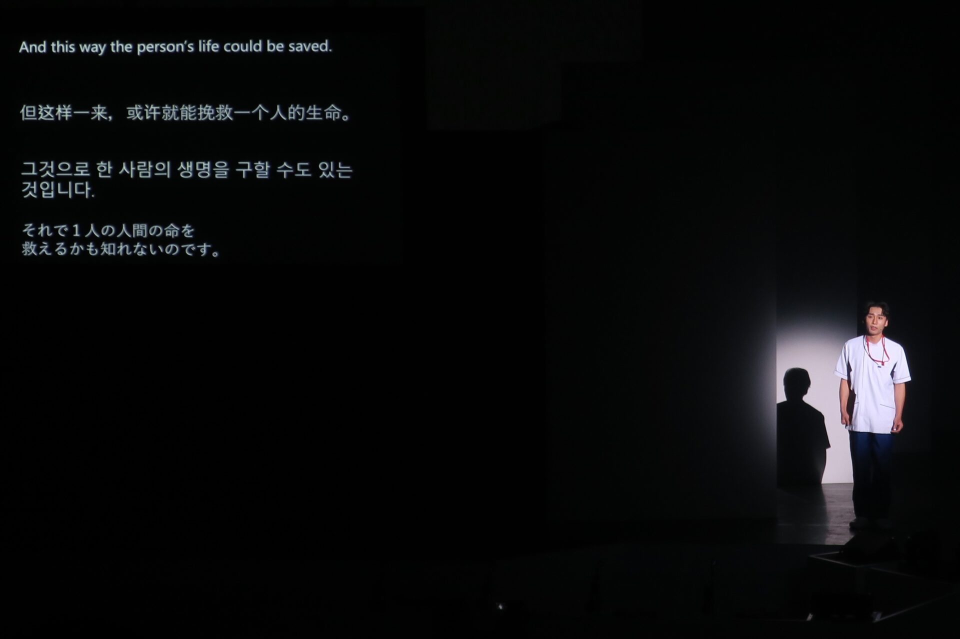 ミュージカルのテーマである骨髄バンクのドナー登録については、学生が扮する医師のセリフやスクリーンの字幕を通して詳しく説明がなされました。骨髄移植には白血球の型であるHLA型が適合することが必要ですが、適合する確率は血縁者で4分の1、非血縁者で数百から数万分と大変低いのが現実。一方、日本で骨髄移植を必要とする患者は今年5月末現在約1700人で、骨髄バンクのドナー登録者数は約56万人。医師役の学生は「ドナー登録者は多いように思われますが、まだまだ足りないのが現実です」と訴えました。