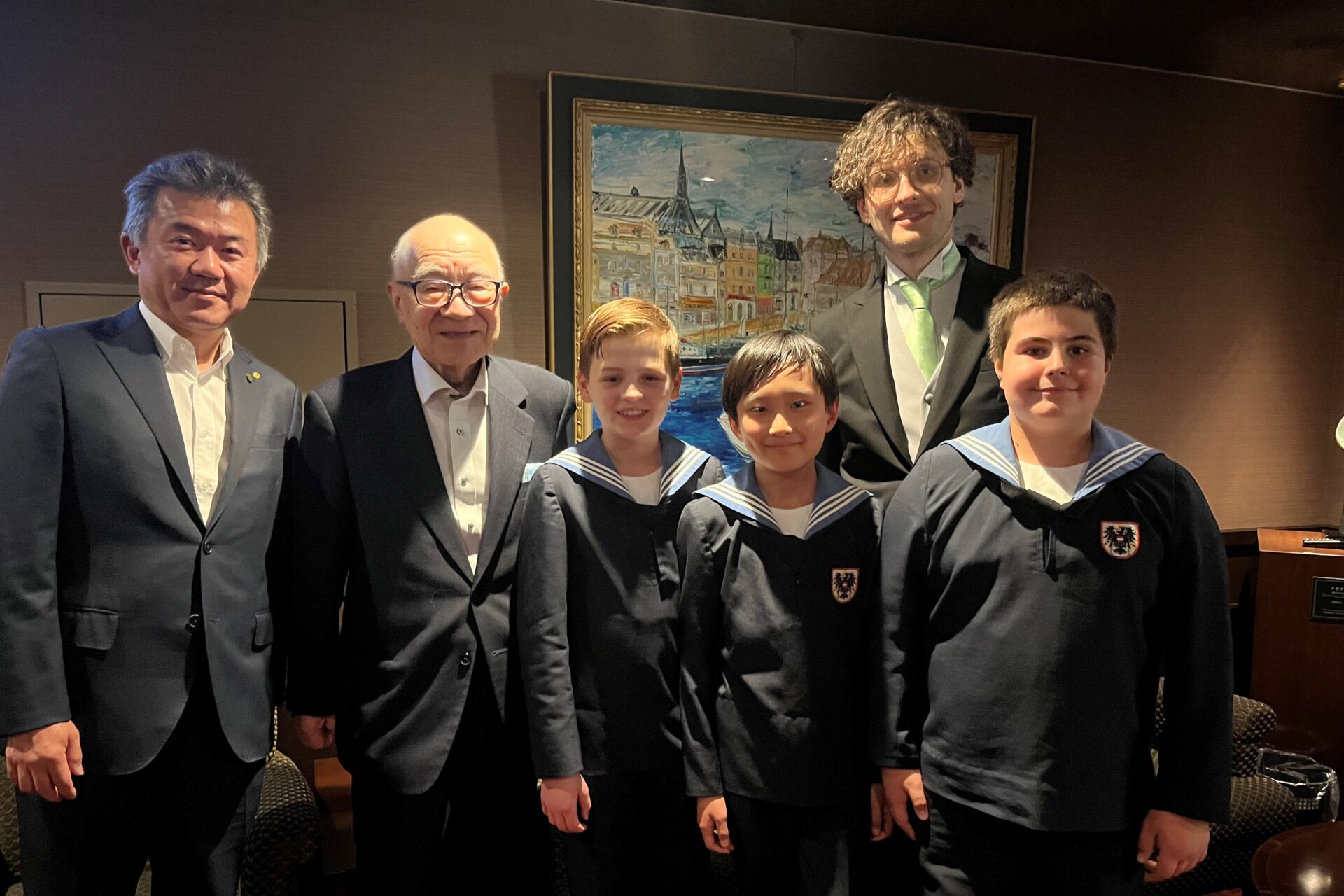また5月31日(土)には、大阪・北区のザ・シンフォニーホールで「ウィーン少年合唱団」の公演がありました。滋慶学園グループの浮舟邦彦総長もお越しになり、「天使の歌声」を楽しまれました。終演後、浮舟総長はザ・シンフォニーホールの取締役ゼネラルマネージャー/音楽総監督の喜多弘悦さんとともに、カペルマイスターのM.フーバーさん、合唱団メンバーと面会。演奏を聴かれた感想などについてお話をされていました。