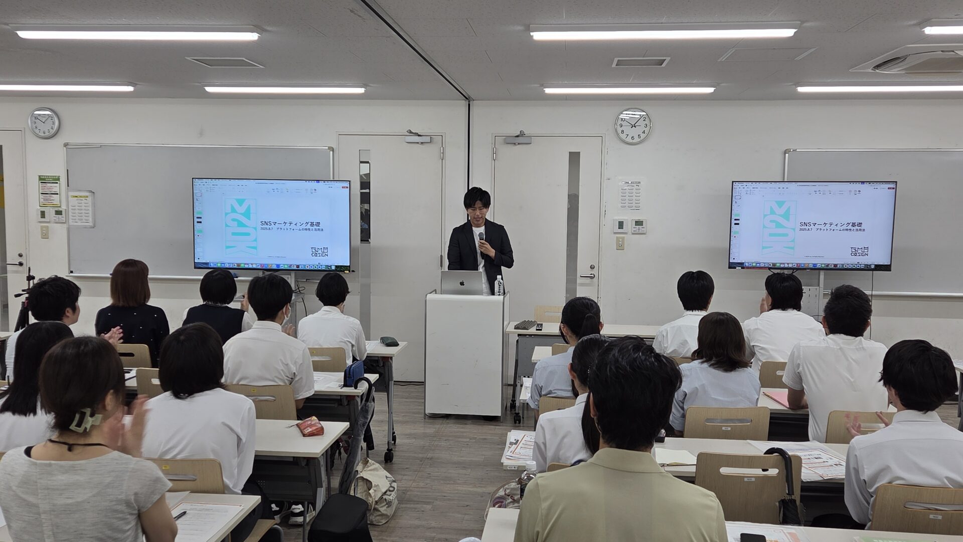 講師は、放送芸術学院専門学校でも講師を務めていただいている株式会社M2DKの名雪光先生。M2DKはYouTubeやTikTokなどのショート動画を中心としたSNSマーケティング会社で、企業や自治体などを対象とした「ショート動画コンサルティング」などにも取り組んでいます。名雪先生はご自身の経験を踏まえて、日々変化するSNSの活用法や特徴を説明し、ショート動画制作に向けた基本スキルやノウハウについて、次の内容を重点にお話しされました。
